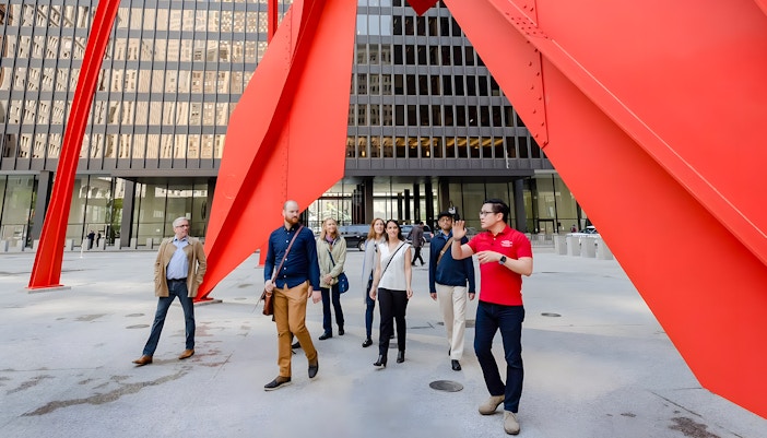 De kassa van het Chicago Architecture Center sluit een uur voor sluitingstijd.